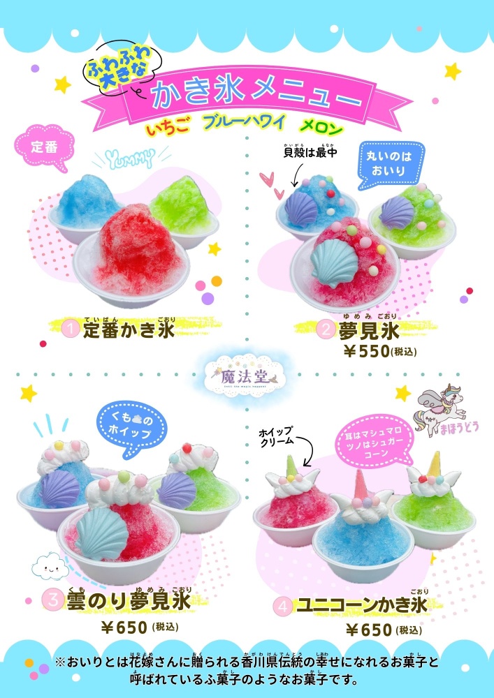 もちもち生地にたっぷりホイップクリームが入ったクレープは、王道のチョコバナナから、ユニコーンの形をしたユニコーンクレープや、カラフルな、おいりという幸せになれるお菓子を使った魔法堂クレープなど、ゆめかわで心ときめくクレープを多数ご用意しております🦄🫧💖